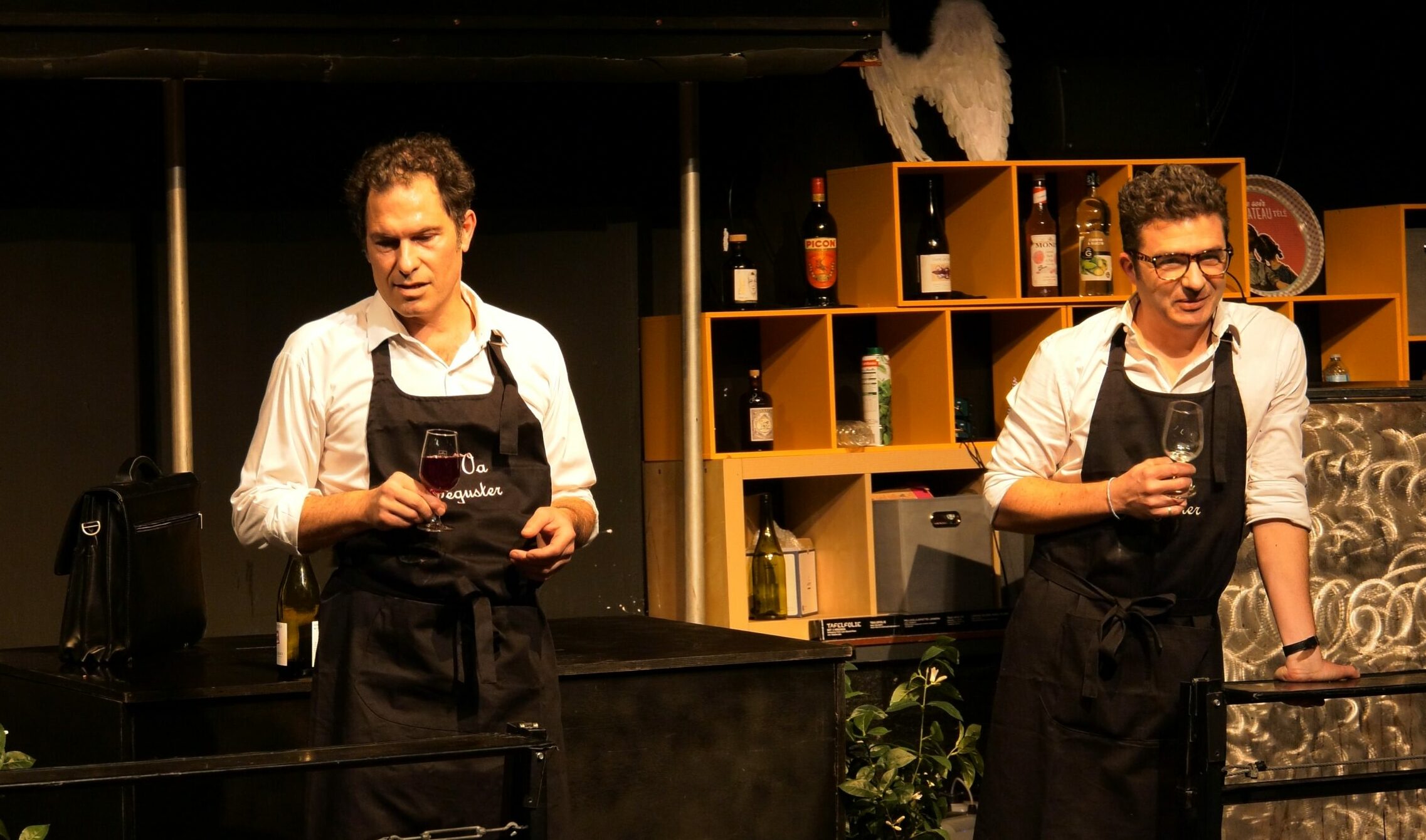 On va déguster est une dégustation-spectacle aussi sérieuse qu’absurde. Sylvain et Sébastien, diplômés en œnologie à l’Université de Cognac, invitent